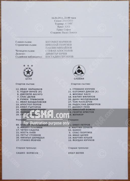 ЦСКА выиграл у Славия 1913 (София) со счётом 1:0 в матче „А“ футбольная группа 2010/11 сыгранный 16 Апрель 2011 г. в 21:00 ч. на стадионе „Васил Левски“ в София. за армейцев отличился Gregari Nelson (3′).