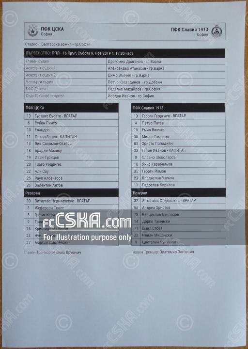 ЦСКА выиграл у Славия 1913 (София) со счётом 1:0 в матче Первая профессиональная лига 2019/20 сыгранный 9 Ноябрь 2019 г. в 17:30 ч. на стадионе „Болгарска армия“ в София. за армейцев отличился Али Соу (66′).