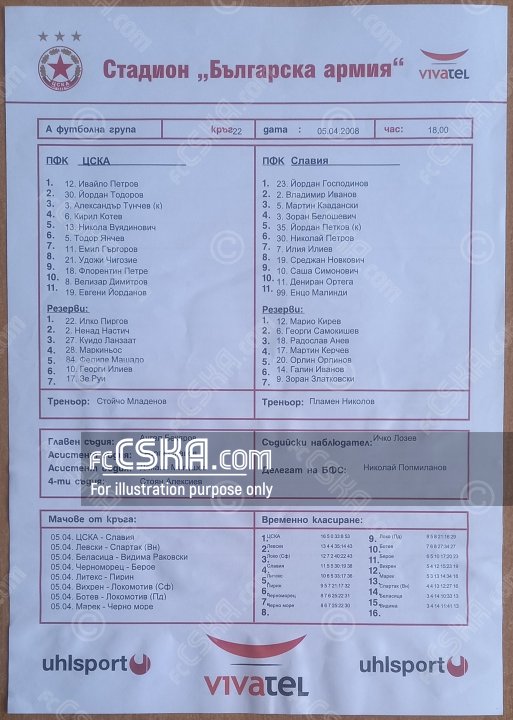 ЦСКА выиграл у Славия 1913 (София) со счётом 2:0 в матче «А» футбольная группа 2007/08 сыгранный 5 Апрель 2008 г. в 18:00 ч. на стадионе „Болгарска армия“ в София. за армейцев отличились Florentin Petre (16′ from penalty) и Александар Тунчев (39′).