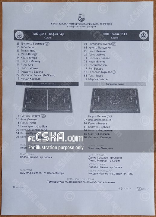 ЦСКА проиграла Славия 1913 (София) со счётом 7:8 в матче Кубок Болгарии 2021/22 сыгранный 21 Апрель 2022 г. в 19:00 ч. на стадионе „Болгарска армия“ в София. за армейцев отличились Грэм Кэри (134′ from penalty), Карло Мухар (136′ from penalty), Амос Юга (138′ from penalty), Томас Лам (140′ from penalty), Хорди Кайседо (142′ from penalty), Асен Дончев (144′ from penalty) и Брэдли Мазику (148′ from penalty).