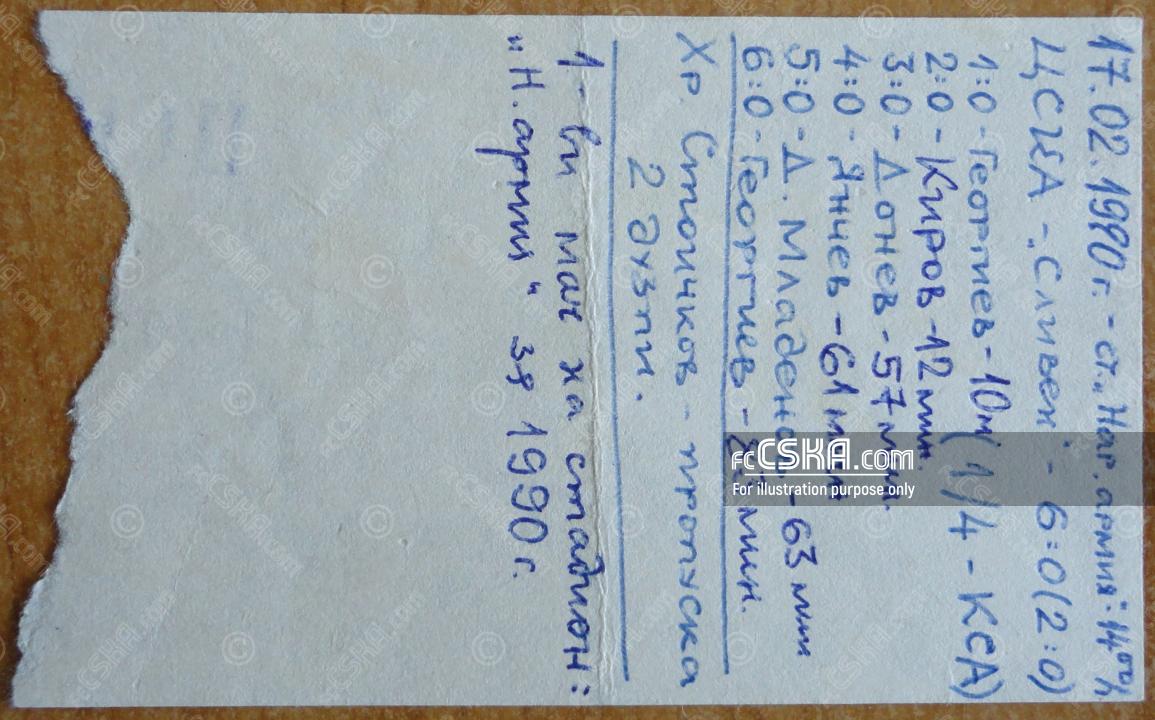 ЦСКА выиграл у Сливен (Сливен) со счётом 6:0 в матче Кубок Советской армии 1989/90 сыгранный 17 Февраль 1990 г. в 14:00 ч. на стадионе „Народна армия“ в София. за армейцев отличились Georgi K. Georgiev (10′ и 83′), Ivaylo Kirov (12′), Doncho Donev (57′), Костадин Янчев (61′) и Dimitar Mladenov (63′).