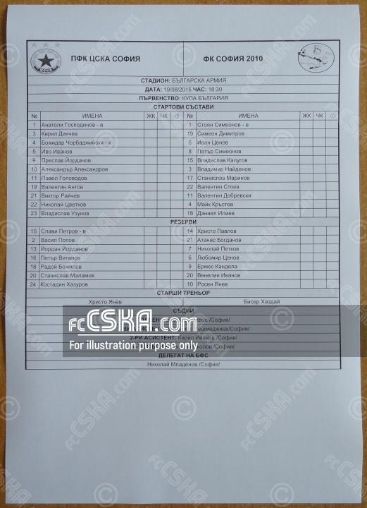 ЦСКА выиграл у София 2010 (София) со счётом 4:1 в матче Кубок Болгарии 2015/16 сыгранный 19 Август 2015 г. в 18:30 ч. на стадионе „Болгарска армия“ в София. за армейцев отличились Preslav Yordanov (23′ и 89′) и Nikolay Tsvetkov (29′). Автогол - guests scored Валентин Стоев[1] (12′).