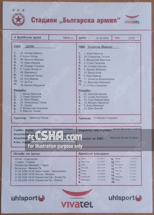 ЦСКА выиграл у Спартак (Варна) со счётом 3:0 в матче «А» футбольная группа 2008/09 сыгранный 30 Август 2008 г. в 20:00 ч. на стадионе „Болгарска армия“ в София. за армейцев отличились Ze Ruy (18′), Yordan Todorov (58′) и Shaloze Udodzhi (79′).