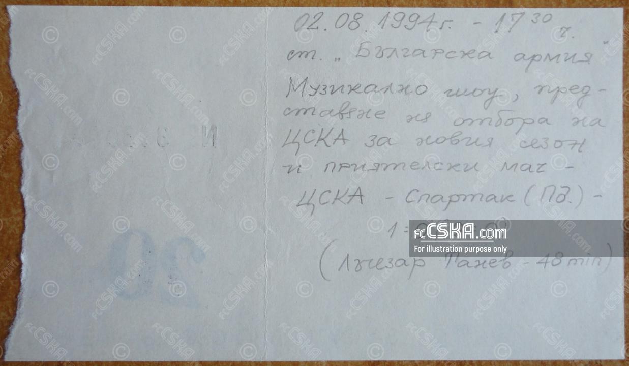 ЦСКА выиграл у Спартак (Пловдив) со счётом 1:0 в матче Товарищеские матчи 1994/95 сыгранный 2 Август 1994 г. в 18:00 ч. на стадионе „Болгарска армия“ в София. за армейцев отличился Лачезар Танев (48′).