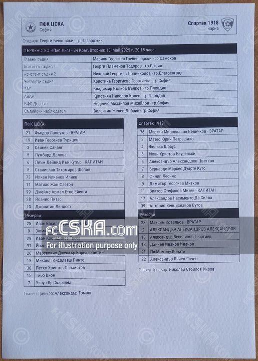 ЦСКА выиграл у Спартак 1918 (Варна) со счётом 5:0 в матче Первая профессиональная лига 2024/25 - вторая группа сыгранный 13 Май 2025 г. в 20:15 ч. на стадионе „Георги Бенковски“ в Пазарджик. за армейцев отличились Станислав Шопов (28′), Иоаннис Питтас (53′), Сейни Саньянг (55′), Илиан Илиев (61′) и Зюмюр Бютучи (83′).