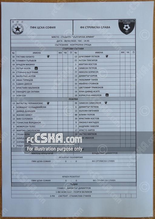ЦСКА выиграл у Струмска слава 1927 (Радомир) со счётом 2:0 в матче Товарищеские матчи 2019/20 сыгранный 8 Февраль 2020 г. в 14:45 ч. на стадионе „Болгарска армия“ в София. за армейцев отличились Stefano Beltrame (44′) и Ruben Pinto (79′ from penalty).