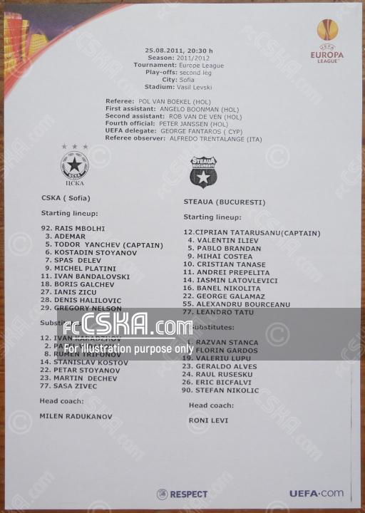 ЦСКА сыграла вничью с фк Стяуа (Бухарест) со счётом 1:1 в матче сыгранный 25 Август 2011 г. в 20:30 ч. на стадионе „Васил Левски“ в София. за армейцев отличился Mishel Platini (83′).