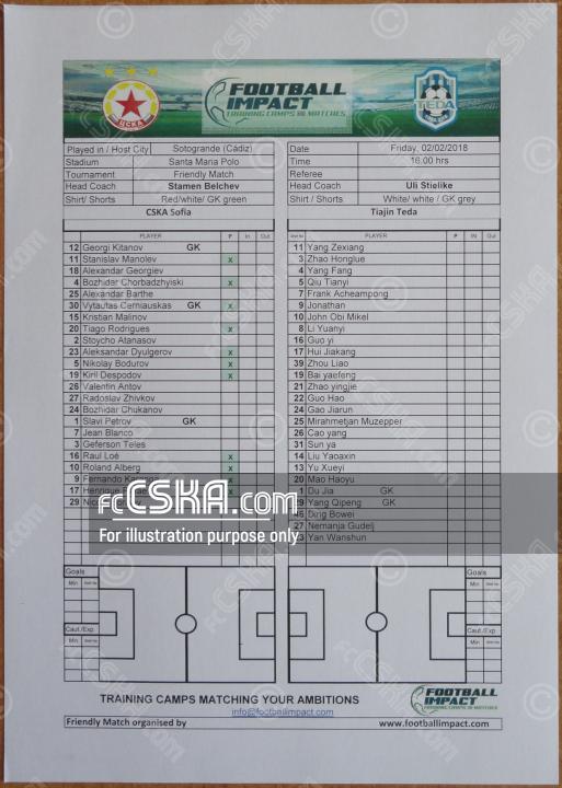 ЦСКА сыграла вничью с фк Тиендзин ТЕДА со счётом 1:1 в матче Товарищеские матчи 2017/18 сыгранный 2 Февраль 2018 г. в 17:00 ч. за армейцев отличился Fernando Karanga (7′).