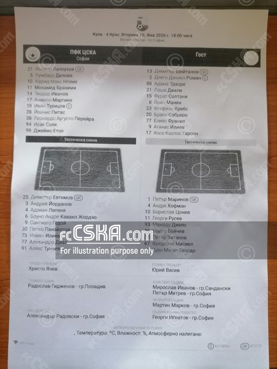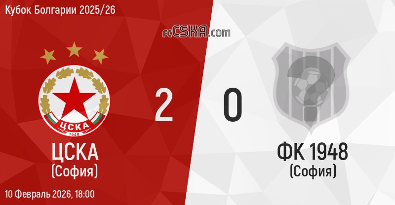 ЦСКА выиграл у ФК 1948 (София) со счётом 2:0 в матче Кубок Болгарии 2025/26 сыгранный 10 Февраль 2026 г. в 18:00 ч. на стадионе „Васил Левски“ в София. за армейцев отличились Иоаннис Питтас (9′) и Макс Эбонг (74′).