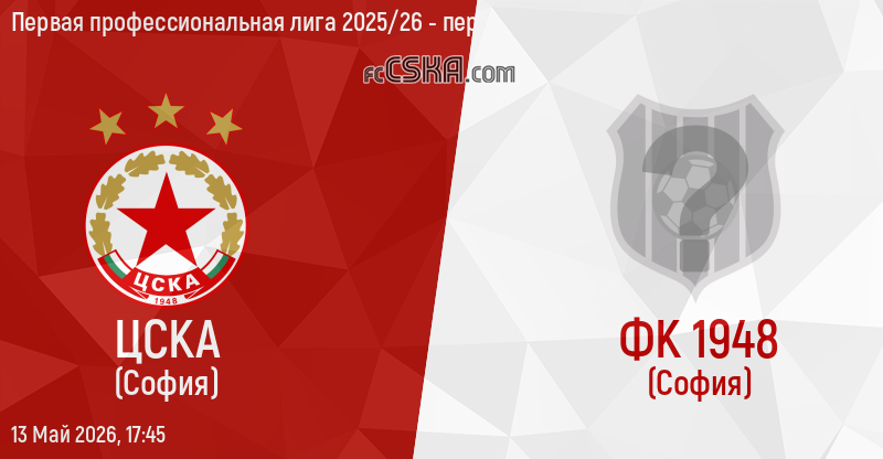 ЦСКА​ будет играть с ФК 1948 в матче Первая профессиональная лига 2025/26 - первая группа 13 Май 2026 г. в 17:45 ч. на стадионе „Васил Левски“ в София. матч будет транслироваться в прямом эфире „Diema sport”.