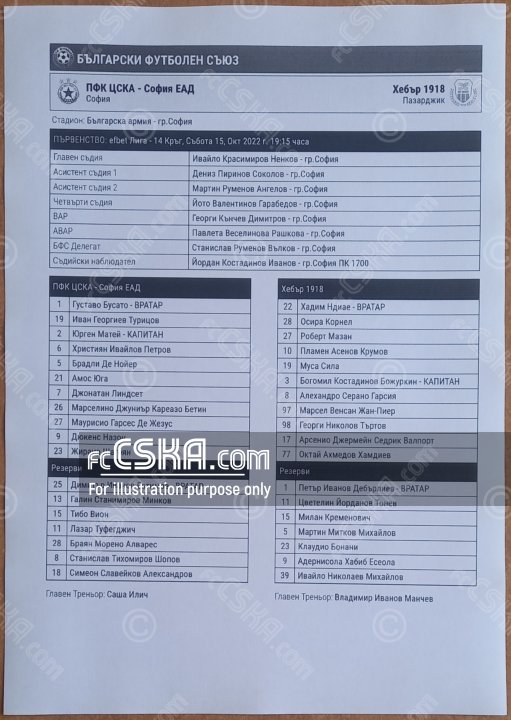 ЦСКА​ выиграл у Хебар 1918 (Пазарджик) со счётом 4:0 в матче Первая профессиональная лига 2022/23 сыгранный 15 Октябрь 2022 г. в 19:15 ч. на стадионе „Болгарска армия“ в София. за армейцев отличились Дюкенс Назон (32′ и 56′) и Браян Морено (61′ и 71′).