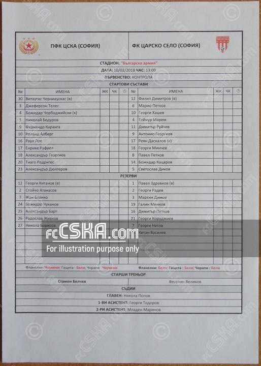 ЦСКА выиграл у Царско село 2015 (София) со счётом 2:1 в матче Товарищеские матчи 2017/18 сыгранный 10 Февраль 2018 г. в 13:00 ч. на стадионе „Болгарска армия“ в София. за армейцев отличились Fernando Karanga (52′) и Zhan Blanko (76′).