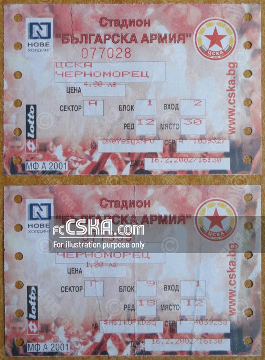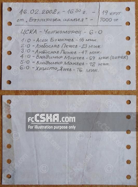 ЦСКА выиграл у Черноморец (Бургас) со счётом 6:0 в матче Высшая профессиональная лига 2001/02 сыгранный 16 Февраль 2002 г. в 16:30 ч. на стадионе „Болгарска армия“ в София. за армейцев отличились Асен Букарев (16′), Любослав Пенев (23′ и 47′), Владимир Манчев (69′ и 72′) и Христо Янев (76′).