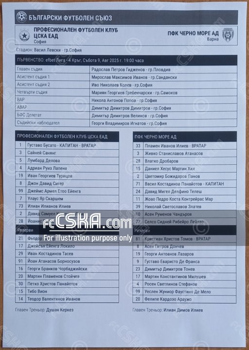 ЦСКА сыграла вничью с фк Черно море (Варна) со счётом 0:0 в матче Первая профессиональная лига 2025/26 сыгранный 9 Август 2025 г. в 19:00 ч. на стадионе „Васил Левски“ в София.