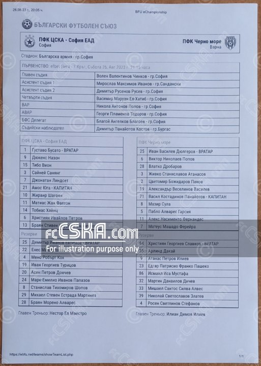 ЦСКА сыграла вничью с фк Черно море (Варна) со счётом 1:1 в матче Первая профессиональная лига 2023/24 сыгранный 26 Август 2023 г. в 21:15 ч. на стадионе „Болгарска армия“ в София. за армейцев отличился Дюкенс Назон (15′).