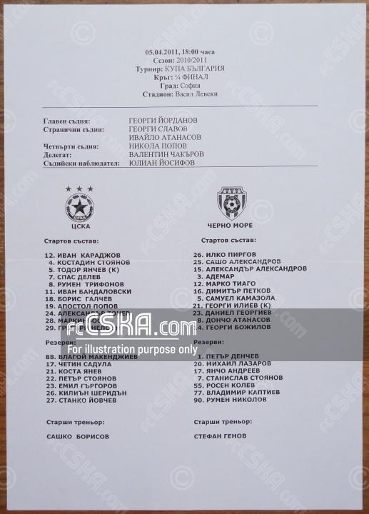 ЦСКА выиграл у Черно море (Варна) со счётом 2:0 в матче Кубок Болгарии 2010/11 сыгранный 5 Апрель 2011 г. в 18:00 ч. на стадионе „Васил Левски“ в София. за армейцев отличились Spas Delev (34′) и Markinyosh (67′).