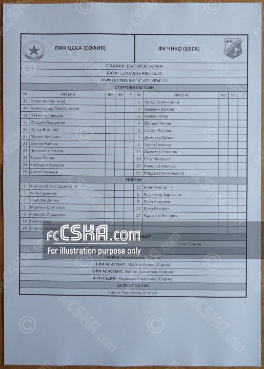 ЦСКА выиграл у Чико (Бяга) со счётом 5:0 в матче Юго-Западная «В» группа 2015/16 сыгранный 23 Март 2016 г. в 18:00 ч. на стадионе „Болгарска армия“ в София. за армейцев отличились Костадин Хазуров (3′ from penalty, 23′ и 25′), Павел Головодов (59′) и Nikolay Tsvetkov (84′).