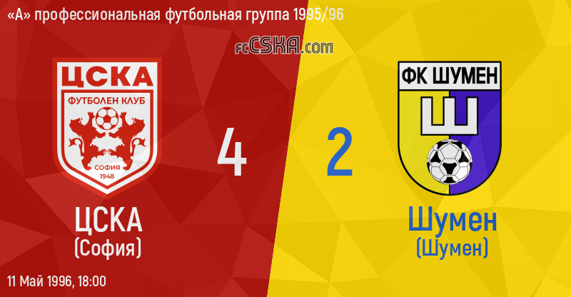 ЦСКА​ выиграл у Шумен (Шумен) со счётом 4:2 в матче «А» профессиональная футбольная группа 1995/96 сыгранный 11 Май 1996 г. в 18:00 ч. на стадионе „Болгарска армия“ в София. за армейцев отличились Ристе Милосавов (5′ и 56′), Петр Жабов (72′) и Petar Mihtarski (85′).