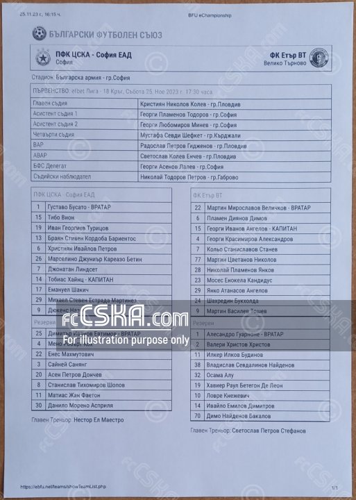 ЦСКА​ выиграл у Этыр ВТ (Велико Тырново) со счётом 2:0 в матче Первая профессиональная лига 2023/24 сыгранный 26 Ноябрь 2023 г. в 18:30 ч. на стадионе „Болгарска армия“ в София. за армейцев отличились Джонатан Линдсет (84′) и Християн Петров (86′).