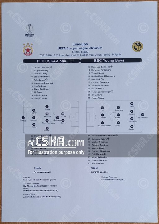 ЦСКА​ проиграла Янг Бойз (Берн) со счётом 0:1 в матче Лига Европы 2020/21 - группа «A» сыгранный 26 Ноябрь 2020 г. в 19:55 ч. на стадионе „Васил Левски“ в София.
