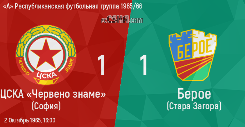 ЦСКА «Червено знаме» сыграла вничью с фк Берое (Стара Загора) со счётом 1:1 в матче «А» Республиканская футбольная группа 1965/66 сыгранный 2 Октябрь 1965 г. в 16:00 ч. на стадионе „Народна армия“ в София. за армейцев отличился Yanko Kirilov (50′).