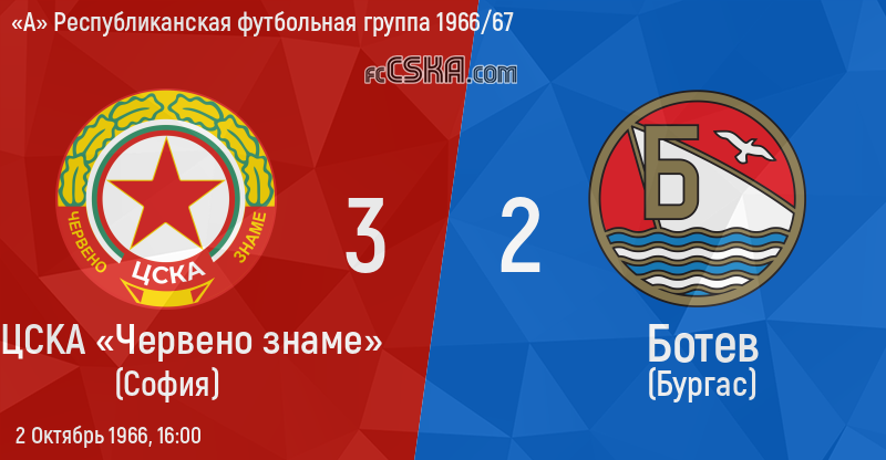 ЦСКА «Червено знаме» выиграл у Ботев (Бургас) со счётом 3:2 в матче «А» Республиканская футбольная группа 1966/67 сыгранный 2 Октябрь 1966 г. в 16:00 ч. на стадионе „Народна армия“ в София. за армейцев отличились Иван Колев (35′ from penalty и 89′) и Аспарух Никодимов (57′).