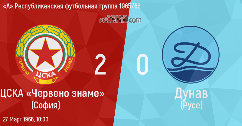 ЦСКА «Червено знаме» выиграл у Дунав (Русе) со счётом 2:0 в матче «А» Республиканская футбольная группа 1965/66 сыгранный 27 Март 1966 г. в 10:00 ч. на стадионе „Народна армия“ в София. за армейцев отличились Аспарух Никодимов (1′) и Димитр Якимов (78′).
