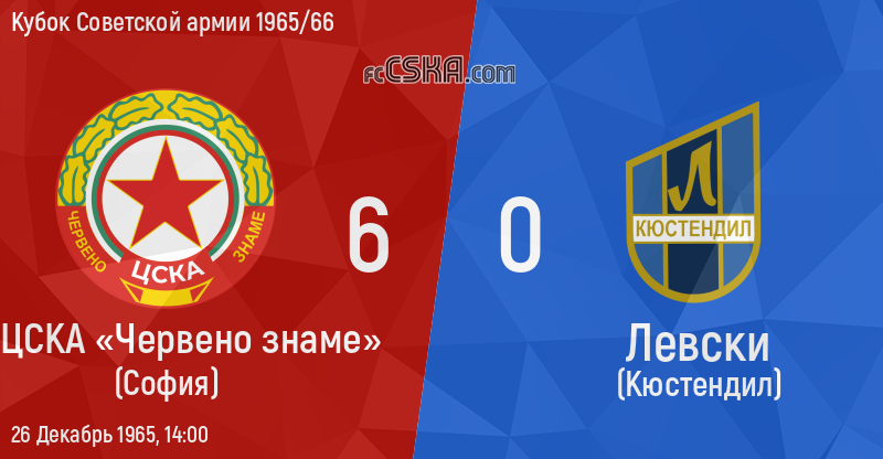 ЦСКА «Червено знаме» выиграл у Левски (Кюстендил) со счётом 6:0 в матче Кубок Советской армии 1965/66 сыгранный 26 Декабрь 1965 г. в 14:00 ч. на стадионе „Народна армия“ в София. за армейцев отличились Никола Цанев (15′), Аспарух Никодимов (35′), Цветан Атанасов (64′ и 69′), Vasil Romanov (83′) и Борис Станков (86′).