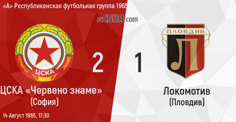 ЦСКА «Червено знаме» выиграл у Локомотив (Пловдив) со счётом 2:1 в матче «А» Республиканская футбольная группа 1965/66 сыгранный 14 Август 1965 г. в 17:30 ч. на стадионе „Народна армия“ в София. за армейцев отличились Yanko Kirilov (56′ from penalty) и Борис Станков (63′).