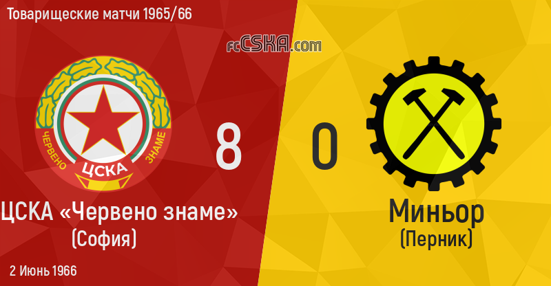 ЦСКА «Червено знаме» выиграл у Миньор (Перник) со счётом 8:0 в матче Товарищеские матчи 1965/66 сыгранный 2 Июнь 1966 г.