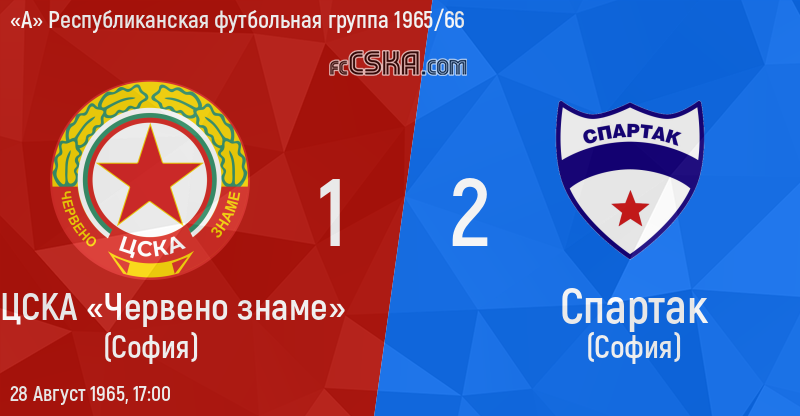 ЦСКА «Червено знаме» проиграла Спартак (София) со счётом 1:2 в матче «А» Республиканская футбольная группа 1965/66 сыгранный 28 Август 1965 г. в 17:00 ч. на стадионе „Народна армия“ в София. за армейцев отличился Никола Цанев (32′).