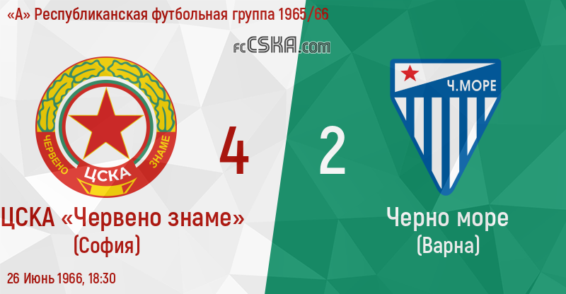 ЦСКА «Червено знаме» выиграл у Черно море (Варна) со счётом 4:2 в матче «А» Республиканская футбольная группа 1965/66 сыгранный 26 Июнь 1966 г. в 18:30 ч. на стадионе „Народна армия“ в София. за армейцев отличились Yanko Kirilov (28′, 34′ и 49′) и Ivan Vasilev (36′ from penalty).