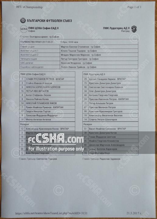 ЦСКА II проиграла Лудогорец 1945 II (Разград) со счётом 0:2 в матче Вторая профессиональная лига 2016/17 сыгранный 21 Май 2017 г. в 18:00 ч. на стадионе „Болгарска армия“ в София.