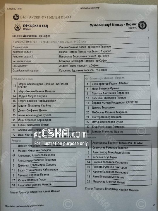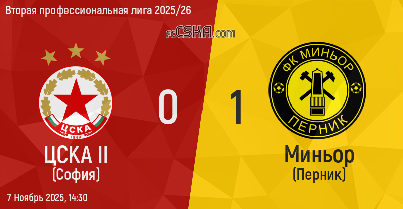 ЦСКА II проиграла Миньор (Перник) со счётом 0:1 в матче Вторая профессиональная лига 2025/26 сыгранный 7 Ноябрь 2025 г. в 14:30 ч.