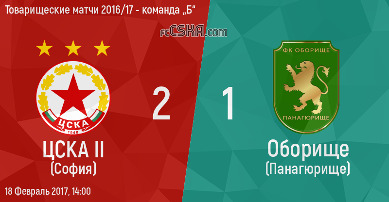 ЦСКА II​ выиграл у Оборище (Панагюрище) со счётом 2:1 в матче Товарищеские матчи 2016/17 - команда „Б“ сыгранный 18 Февраль 2017 г. в 14:00 ч. на стадионе „сп. компл. „ЦСКА““ в Панчарево.