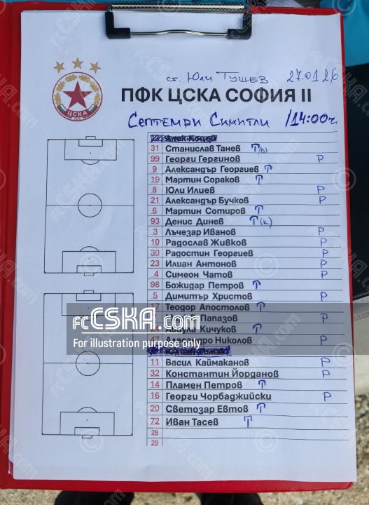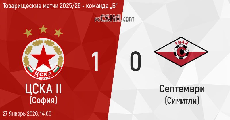 ЦСКА II выиграл у Септември (Симитли) со счётом 1:0 в матче Товарищеские матчи 2025/26 - команда „Б“ сыгранный 27 Январь 2026 г. в 14:00 ч. на стадионе „Спортен центыр „Юлий Тушев"“ в с. Вылково.