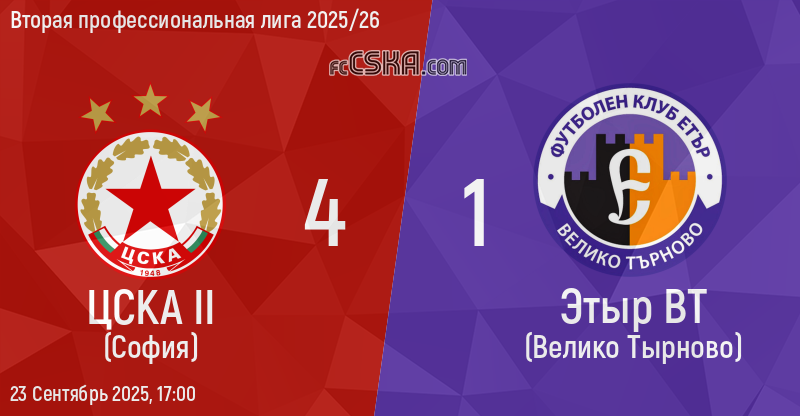 ЦСКА II выиграл у Этыр ВТ (Велико Тырново) со счётом 4:1 в матче Вторая профессиональная лига 2025/26 сыгранный 23 Сентябрь 2025 г. в 17:00 ч.