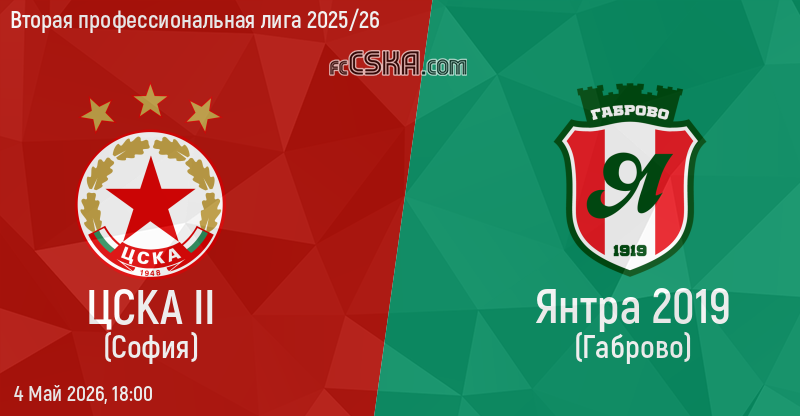 ЦСКА II будет играть с Янтра в матче Вторая профессиональная лига 2025/26 4 Май 2026 г. в 18:00 ч.