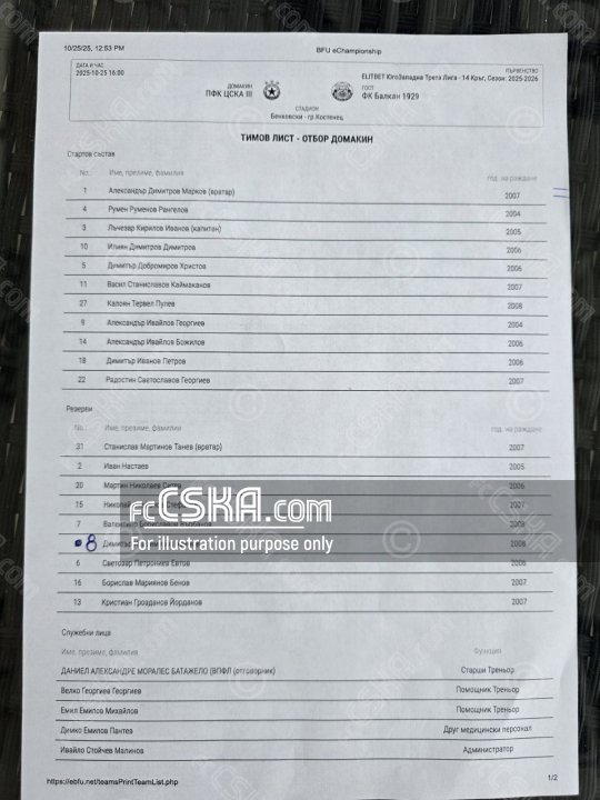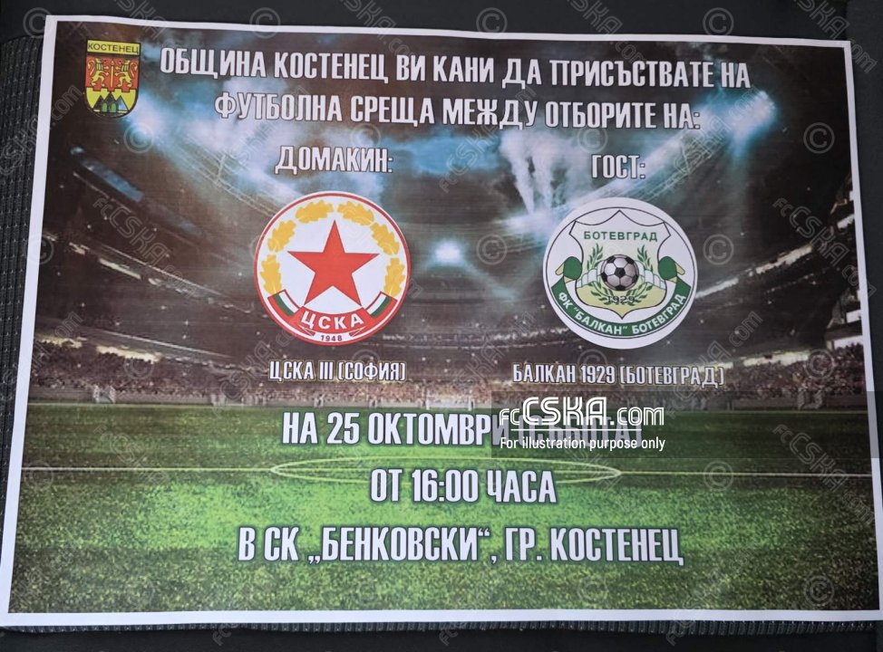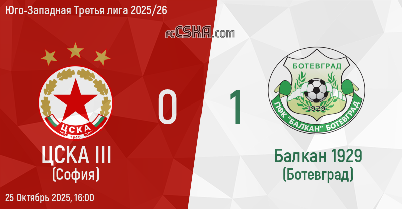 ЦСКА III проиграла Балкан 1929 (Ботевград) со счётом 0:1 в матче Юго-Западная Третья лига 2025/26 сыгранный 25 Октябрь 2025 г. в 16:00 ч. на стадионе „Бенковски“ в Костенец.