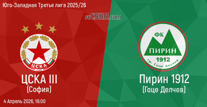 ЦСКА III будет играть с Пирин ГД в матче Юго-Западная Третья лига 2025/26 4 Апрель 2026 г. в 16:00 ч. на стадионе „Бенковски“ в Костенец.