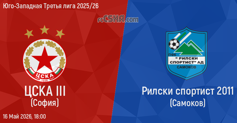 ЦСКА III будет играть с Рилски спортист в матче Юго-Западная Третья лига 2025/26 16 Май 2026 г. в 18:00 ч. на стадионе „Бенковски“ в Костенец. матч будет транслироваться в прямом эфире „Sportbg.bg”.