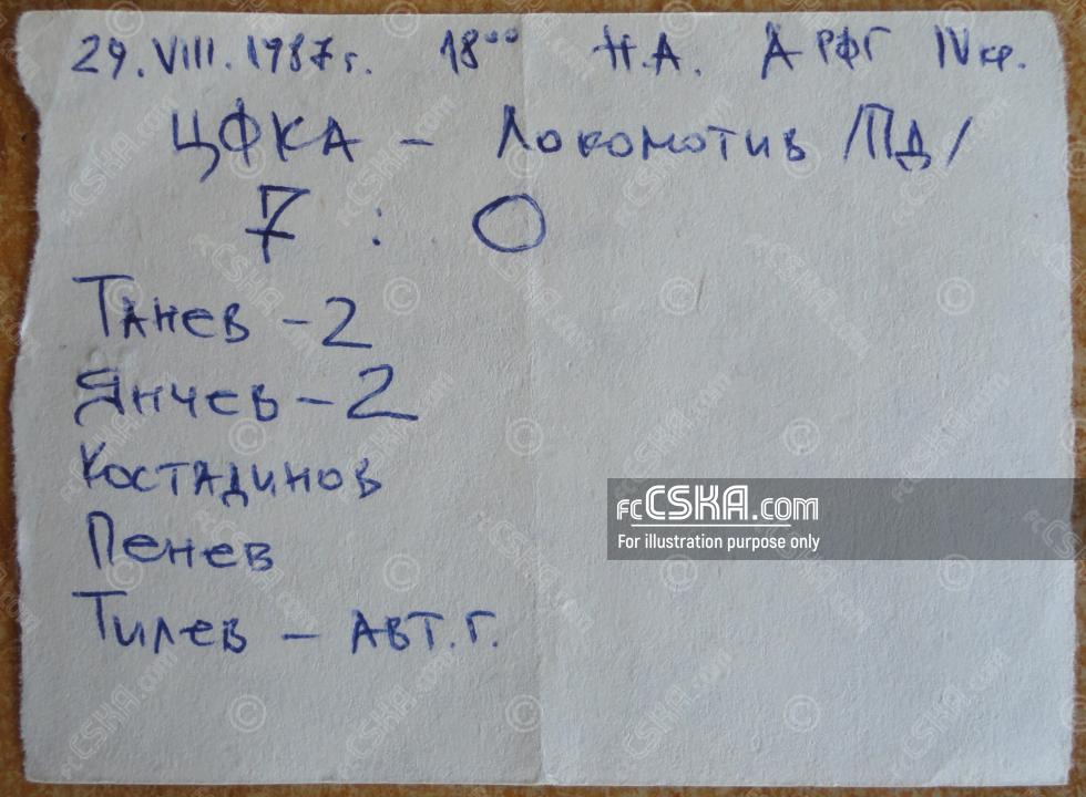 ЦФКА «Средец» выиграл у Локомотив (Пловдив) со счётом 7:0 в матче «А» Республиканская футбольная группа 1987/88 сыгранный 29 Август 1987 г. в 18:00 ч. на стадионе „Народна армия“ в София. за армейцев отличились Костадин Янчев (30′ и 73′), Лачезар Танев (44′ и 60′), Emil Kostadinov (82′) и Любослав Пенев (90′). Автогол - guests scored Богомил Тилев[1] (68′).