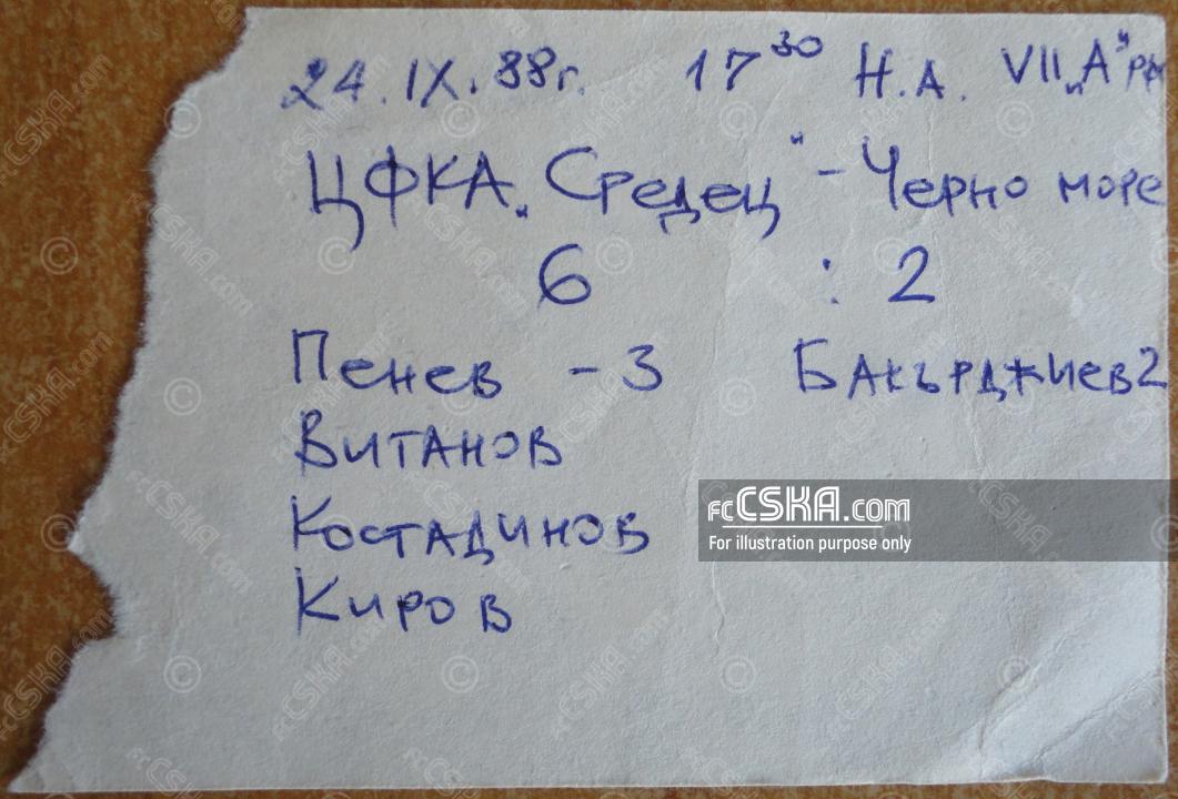 ЦФКА «Средец» выиграл у Черно море (Варна) со счётом 6:2 в матче «А» Республиканская футбольная группа 1988/89 сыгранный 24 Сентябрь 1988 г. в 17:30 ч. на стадионе „Народна армия“ в София. за армейцев отличились Petar Vitanov (4′), Любослав Пенев (9′, 50′ и 83′ from penalty), Ivaylo Kirov (51′) и Emil Kostadinov (59′).