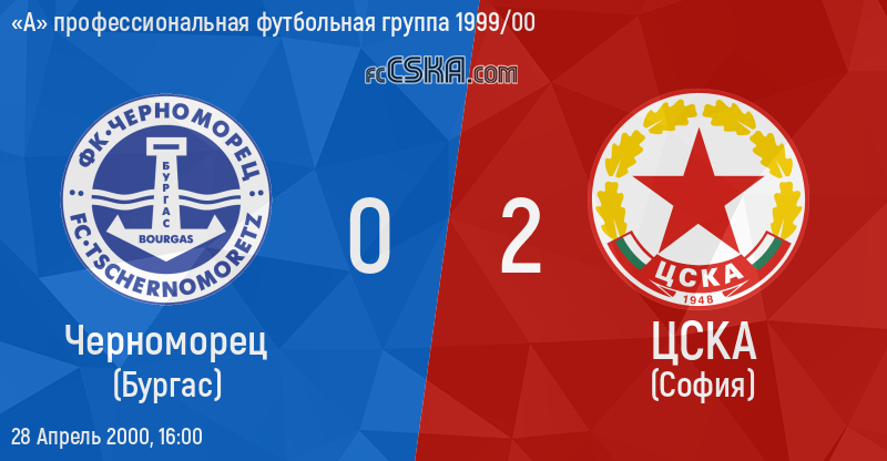 ЦСКА выиграл у Черноморец (Бургас) со счётом 0:2 в матче «А» профессиональная футбольная группа 1999/00 сыгранный 28 Апрель 2000 г. в 16:00 ч. за армейцев отличились Димитр Бербатов (6′) и Румен Калчев (73′).