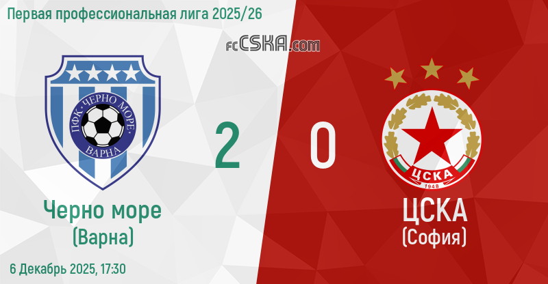 ЦСКА проиграла Черно море (Варна) со счётом 2:0 в матче Первая профессиональная лига 2025/26 сыгранный 6 Декабрь 2025 г. в 17:30 ч. на стадионе „Тича“ в Варна.