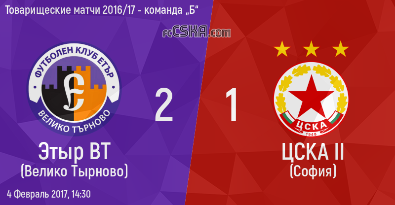 ЦСКА II проиграла Этыр ВТ (Велико Тырново) со счётом 2:1 в матче Товарищеские матчи 2016/17 - команда „Б“ сыгранный 4 Февраль 2017 г. в 14:30 ч. на стадионе „Градски“ в Ловеч.