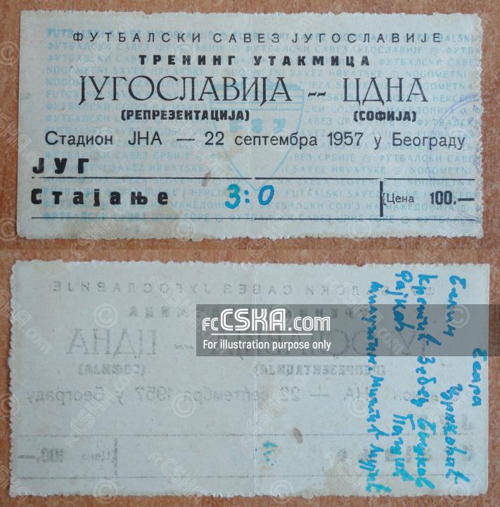 ЦДНА проиграла Югославия со счётом 3:0 в матче Товарищеские матчи 1957 сыгранный 22 Сентябрь 1957 г. на стадионе „ЮНА“ в Белград.