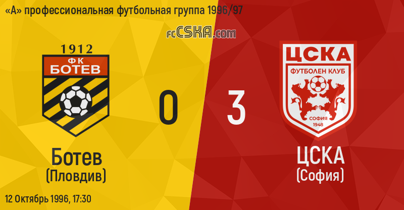 ЦСКА выиграл у Ботев (Пловдив) со счётом 0:3 в матче «А» профессиональная футбольная группа 1996/97 сыгранный 12 Октябрь 1996 г. в 17:30 ч. на стадионе „Христо Ботев“ в Пловдив. за армейцев отличились Анатоли Нанков (66′), Адальберт Зафиров (82′) и Kancho Yordanov (87′).
