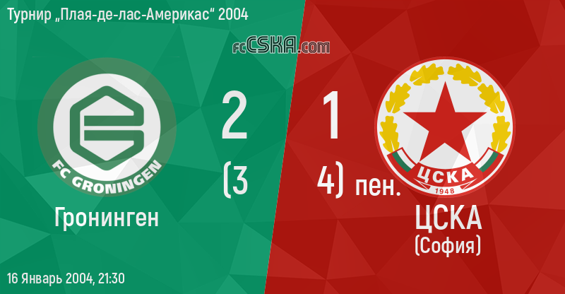 ЦСКА проиграла Гронинген со счётом 2:1 в матче Турнир „Плая-де-лас-Америкас“ 2004 сыгранный 16 Январь 2004 г. в 21:30 ч. на стадионе „Элиодоре Родригес Лопес“ в Санта-Крус-де-Тенерифе. за армейцев отличились Георги Антонов (34′), Zhuau Karlush (95′ from penalty), Светослав Петров (95′ from penalty), Emil Gargorov (95′ from penalty) и Velizar Dimitrov (95′ from penalty).