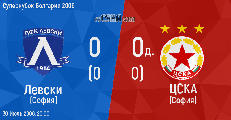 ЦСКА сыграла вничью с фк Левски (София) со счётом 0:0 в матче Суперкубок Болгарии 2006 сыгранный 30 Июль 2006 г. в 20:00 ч. на стадионе „Васил Левски“ в София. за армейцев отличились Eugen Trika (127′ from penalty), Yordan Todorov (127′ from penalty) и Florentin Petre (127′ from penalty).